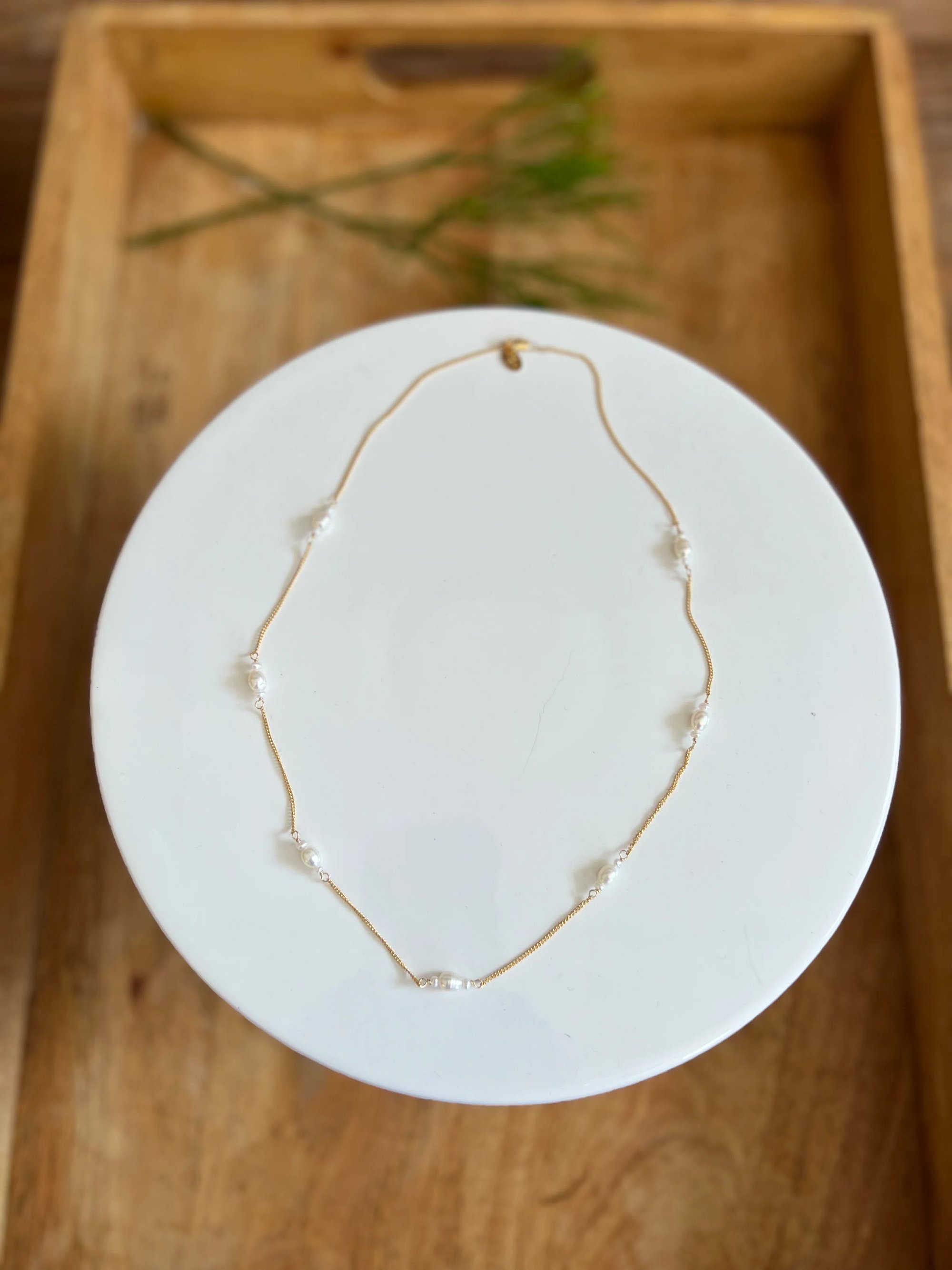 Itty bitty white fresh water pearls with white fresh pearls in the center on 14k gold filled chain. This piece is a little longer than our standard chains to give you a nice layering option