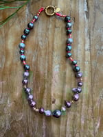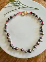 Tahitian pearls strung on neon pink, hand tied with gold filled bead accents